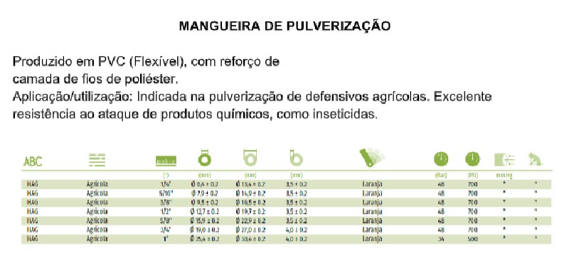 Aplicação/utilização: Indicada na pulverização de defensivos agrícolas. Excelente resistência ao ataque de produtos químicos, como inseticidas.